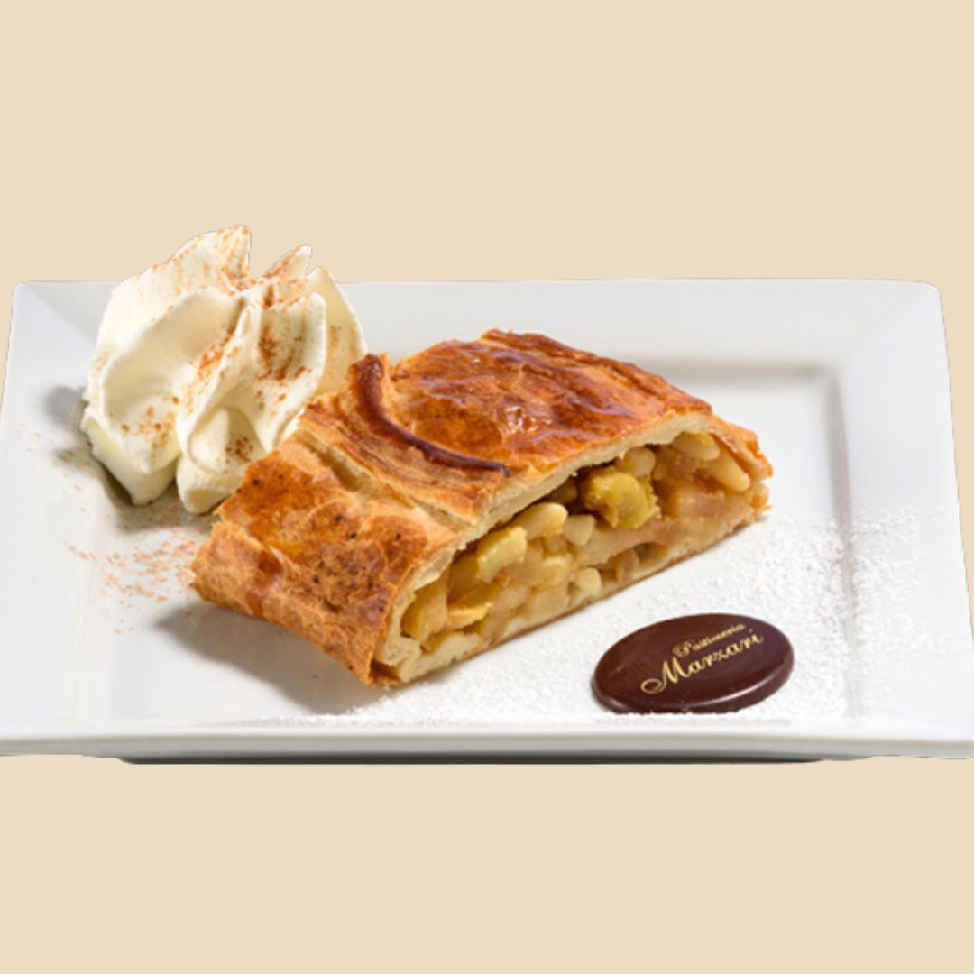 • lo strudel di pasta sfoglia preparato con antiche varietà di mele locali,